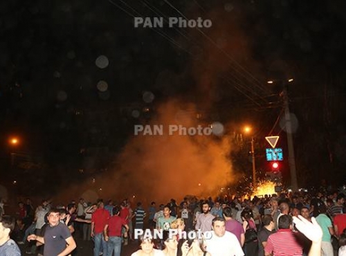Ավելի վաղ բախում էր տեղի ունեցել ոստիկանների և ցուցարարների միջև, որոնք սկսել էին քարեր նետել ոստիկանների ուղղությամբ: Ի պատասխան գազ ու լուսաձայնային նռնակներ են կիրառվել: ՀՀ ոստիկանության պարեկապահակային ծառայության գնդի մոտակայքում տեղի ունեցող միջադեպի հետևանքով նախնական տվյալներով այս պահին տարբեր բուժհաստատություններ է դիմել 45 տուժած, որից 25-ը` ոստիկան: 02:30-ի տվյալներով, Խորենացի փողոցում տեղի ունեցած բախումների հետևանքով մայրաքաղաքի տարբեր բուժհաստատություններ դիմածների թիվը հասել է 51-ի, նրանցից 28-ը` ոստիկան: