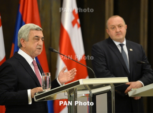 «Ուրախ եմ, որ ﬔր երկրների ﬕջև ավանդական բազմաշերտ կապերը տարեցտարի նոր բովանդակությամբ են հարստացվում: Խոսքս առաջին հերթին այնպիսի կարևոր ոլորտներում համատեղ ձեռքբերուﬓերի մասին է, ինչպիսիք են տրանսպորտային, էներգետիկ, գյուղատնտեսական և զբոսաշրջության ոլորտները: Հետևողականորեն ընդլայնվում և բազմազան է դառնում ﬔր առևտրաշրջանառության կառուցվածքը, ակտիվանում է համագործակցությունը գիտության, մշակույթի և կրթության ոլորտներում», – իր ելույթում ասել Սերժ Սարգսյանը: Վրաստանի նախագահը շնորհավորել է Հայաստանի ԵՄ հետ համաձայնագրի ստորագրման առթիվ և պատրաստակամություն հայտնել կիսել Վրաստանի եվրոպական և եվրատլանտյան ինտեգրման օգուտներով և այն հնարավորություններով, որ երկիրը ստեղծում է տարածաշրջանների և մայրցամաքների ﬕջև համագործակության առումով: