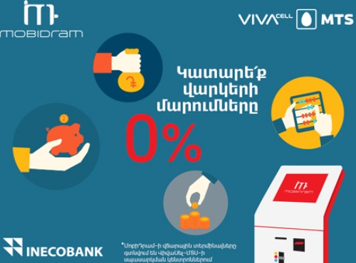 ՎիվաՍել-ՄՏՍ-ը տեղեկացնում է, որ այժմ Ինեկոբանկի կողմից տրամադրվող վարկերի վճարման համար կարելի է օգտվել ՎիվաՍել-ՄՏՍ-ի սպասարկման կենտրոններում գտնվող ՄոբիԴրամ-ի վճարային տերմինալներից:
