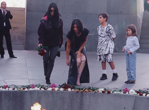 Լուսանկարում Քիմ և Քորթնի Քարդաշյանների և նրանց երեխաների այցն է Ծիծեռնակաբերդ, որտեղ նրանք ծաղիկներ են դնում անմար կրակի մոտ՝ հարգելով Հայոց ցեղասպանության զոհերի հիշատակը: