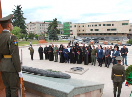 Կաթողիկոսը ծաղկեպսակ դնելուց հետո աղոթել է նահատակված հայորդիների համար, այցելել զոհերի շիրիմներին։
