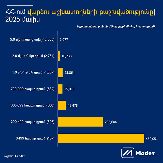 «Մոդեքս» խորհրդատվական ընկերությունը հրապարակել է Հայաստանում վարձու աշխատողների ստացած ամսական աշխատավարձերի վիճակագրությունը՝ ըստ միջակայքերի, 2025 թվականի մայիսի դրությամբ։