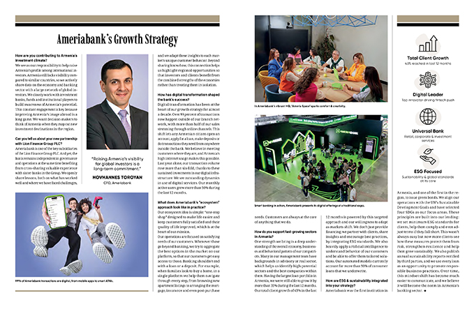Ամերիաբանկի ֆինանսական գծով տնօրեն Հովհաննես Թորոյանը «Ֆորբս» ամսագրի` Հայաստանին նվիրված հատուկ զեկույցում ներառված հարցազրույցում, անդրադարձել է Հայաստանի տնտեսության մեջ Ամերիաբանկի նշանակալի դերակատարությանը` որպես վարկային պորտֆելով խոշորագույն ֆինանսական հաստատությունը Հայաստանում:
