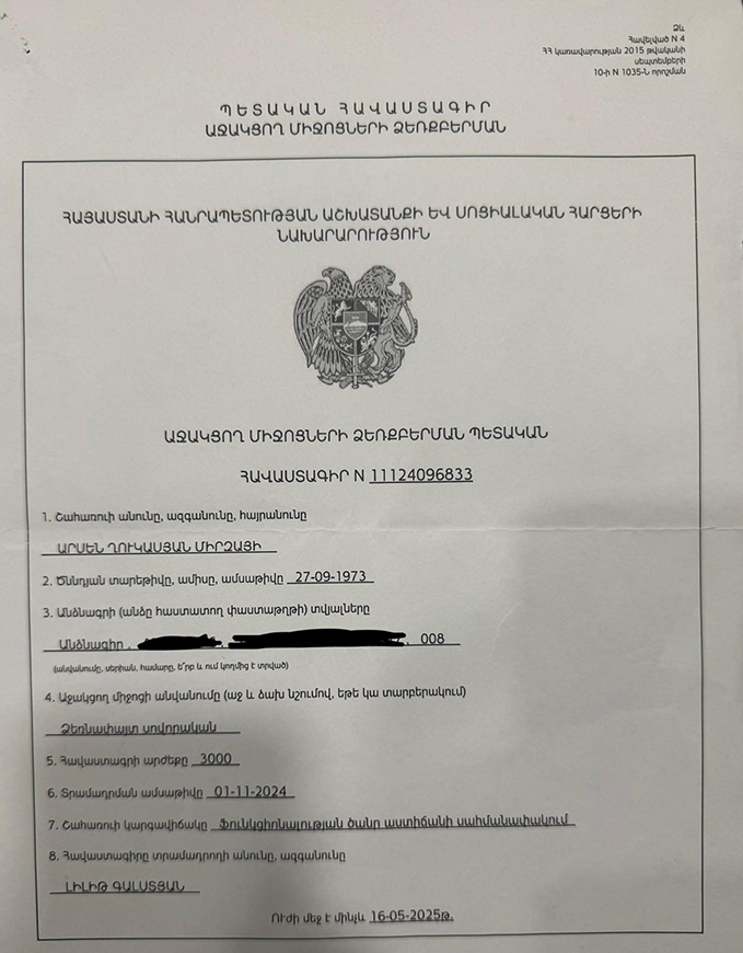 Նա նաև հրապարակել է Ղուկասյանին ձեռնափայտ ցուցված լինելու հավաստագրի լուսանկարը։