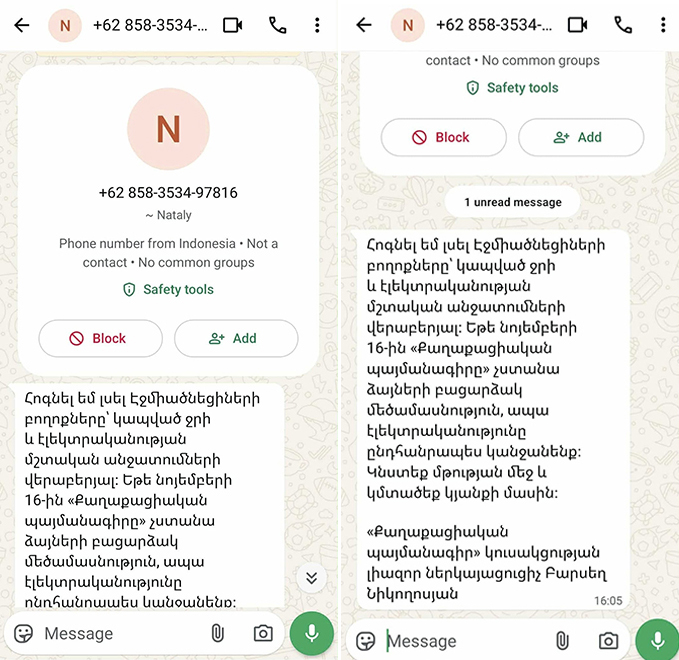 Վերջին ժամերին բազմաթիվ քաղաքացիներ ստանում են կեղծ հաղորդագրություններ (կցում եմ պատկերները), որոնք ուղղված են նախընտրական շրջանում մթնոլորտը պղտորելուն, քաղաքացիներին մոլորեցնելուն։ Եթե նկատեցիք, ուղարկողի համարը հայաստանյան չէ, Ինդոնեզիայի կոդ է։ Մանրուք է, սակայն միշտ պետք է նման մանրուքներին ուշադրություն դարձնել, որպեսզի սադրանքը չհասնի իր արդյունքին։