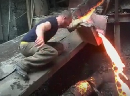 In a remarkable footage a foundry worker can be seen putting his hand straight through boiling hot molten metal.