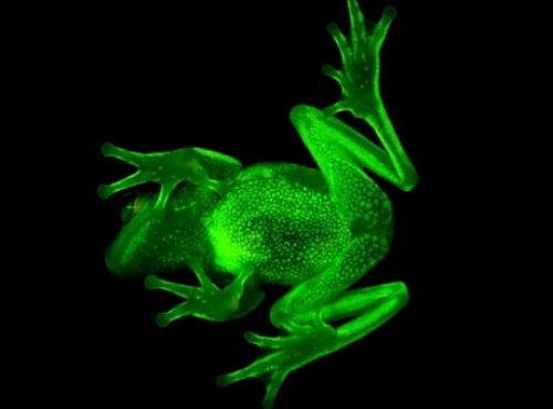 Under normal light the frog's translucent skin is a muted yellowish-brown color with red dots, but when the scientists shone an ultraviolet light on it, it turned a celestial green.