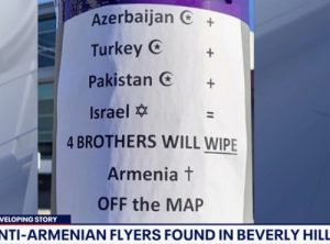 The hate messages were printed on flyers taped to street poles near the intersection of La Cienega Boulevard and Wilshire Boulevard.