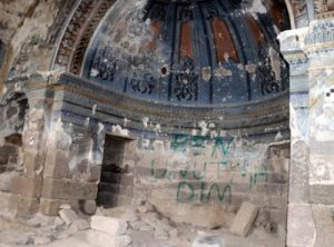 According to media reports, a pit about 2 meters deep was dug in one of the halls of the church, whose walls were also spray painted.