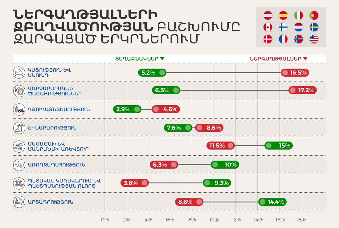 📊 Այս անգամ ինֆոգրաֆիկայում ներկայացնում ենք, թե ինչքանով են ներգաղթյալները ներգրավված աշխատաշուկայում զարգացած երկրներում (Ավստրիա, Նիդերլանդներ, Նորվեգիա, ԱՄՆ և այլն). ներգրավվածության ամենաբարձր մակարդակը կացության, սննդի ու վարչարարական ծառայությունների ոլորտներում է