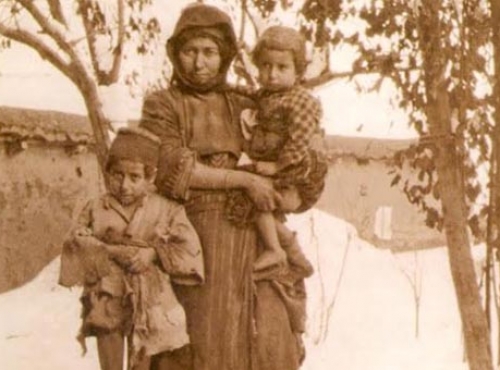 Справа изображена Вардуи Петросян, овдовевшая после резни в Муше, со своими двумя сыновьями зимой 1915/1916 года.