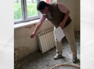 Месроп Манукян показал, как легко плитка со стен снимается вручную, указывая на низкое качество строительства.